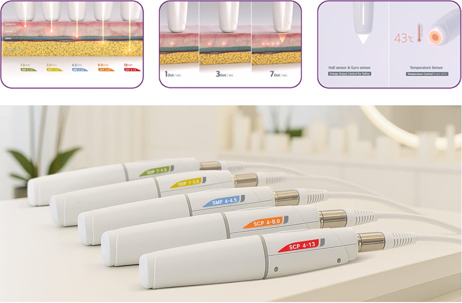Visalift, the microfocused ultrasound in the Pharmaesthetics portfolio, has three different tips that can be used on the face: